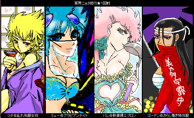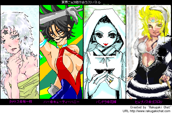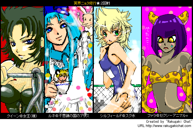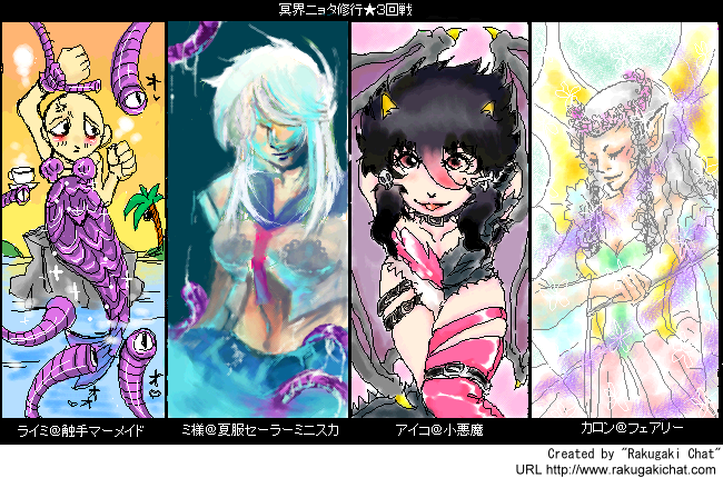 冥界ニョタ修行に参加してきました^^第一回戦はKAKOさん(しどけない……vvv)こばやしさん(可愛らしい……!流し目がセクシーvvv)私(誰だかわかんないよ!)サリヲさん(カッコイイ……!!背景までばっちりですv)二回戦はロムだけで^^ナナオさま(こ……こんな女王様いいなぁ……vvv)こばやしさん(描き込みが細かいですー!アリス可愛いvマルうさとラダねずもv)KAKOさん(まぶしいぜ……!屋上プールなんですね。背景もさすがです^^)サリヲさん(可愛い~~~!ぺったんこ!vvv)第三回戦はKAKOさん(お見事すぎる……触手マーメイド!)にんさん(間近で見てたのに、絵チャで描いたとは思えない……!)私(こ……こあくま……汗)サリヲさん(これカロンですよ!妖精みたい……v)ラストバトルinエリシオン!私のタナトス(布一枚が風呂上りに^^;)サリヲさん(ボインがエロカッコイイvアニメ塗りもお上手v)KAKOさん(色のアクセントが素晴らしいです!神秘的……!)にんさん(ブラとか刺繍の質感すごいです!カッコいい~!)終わったときはもうすっかり朝で^^;でもエリシオンについたーっって感じで清々しかったです(笑)いい修行になりました!皆さんありがとうございましたー!土曜の夜で回線が渋滞、鼻息警報発令中、もうみんな何度も何度も追い出されては這い上がり……その度にレベルアップしました(HNが……笑)最後まで残ったのは結局4人で……まさにラストバトル(笑)残念ながら途中で落ちてしまった方も、ロムだけの方も、本当にお疲れ様でした!またご一緒したいです!絵チャたのしーーー!!!