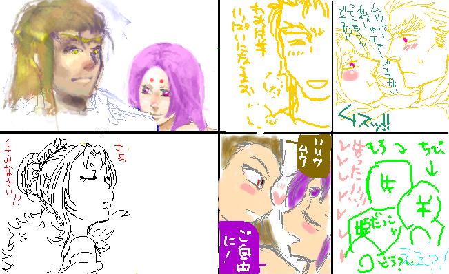 10月6日深夜、拙宅で牛羊絵茶を強行しました!!!!!三連休ということで、どの日も絵茶スケジュールが一杯で……!私が怒涛の実験ラッシュだった先週ですが、王サマの勅命もあって、突然金曜夜に敢行しました……!いきなりだったので、人集まらないかなぁと思っていたのですが、なんと9人も……!!!!!!ありがとうございましたぁ!o(≧∇≦o)(o≧∇≦)ovv幸せすぎる!幸せ……サイコーーーー!!でも皆様お疲れのところで、開始時間も遅かったので、話してるうちに四時半になっちゃった!(汗撮影はしませんでした~ログここに載せますね^^ちょこちょこ編集してます、ご了承くださいませ!お忙しいのにありがとうございましたvvv↓上段:にんさん&王サマ、ナナオさま、亮さん下段:KAKOさん&ちぇりーさん、さがさん、もす&ちぴぃにんさんのバランやわらかそう……!暖かそう!!優しそう~Vvそして見つめるムウ様は王サマ作vvv知的美人!!まさに王道の牛羊ですね……!!ナナオさまと亮さん、最初は分かれていたのですがくっついちゃったvvv愛のなせるワザvKAKOさんの女王受ムウ様とホストなちぇりーさんの牛!!!アルムウと同じくらいラブラブなお二人にジェラシー!!!さがさんは牛羊ラブアニメーションしてて……!ドキドキvvvもすバラン&ちぴぃムウ、色合わせて淡くしてみたよ……!笑 鼻キスvはぁ……!!(満悦)牛羊の夜って……いい……!!!!!こんなに牛羊描いてもらえるとは思わなくって、震え上がりました!スウちゃんも顔出してくださってvお忙しい上お疲れのところ、深く感謝申し上げます……!!!°・:,。★\(^-^ )♪ありがとう♪( ^-^)/★,。・:・°またやりたいです、今度はもっと手際よく采配できるよう頑張ります!(今回はダメ主催だったので……!精進精進……!!)時々開催しますので、今回来てくださった方、来れなかった方もぜひご参加ください!主催成長しますから……!!