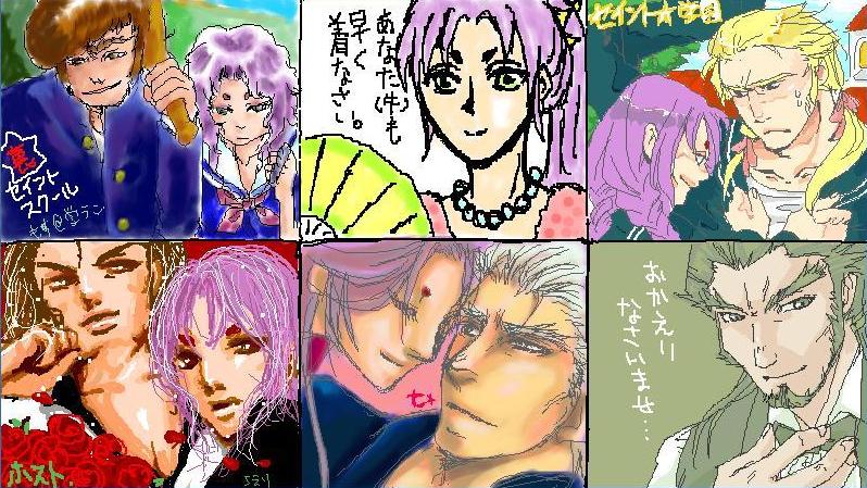 すっかり遅れてしまいましたが、解説を。 いつものメンバーが多いのでわかるかな^^ 牛or羊でアミダコスでした! 左上)もす@学ラン 裏★聖闘士学園!!河川敷のつもりです…… 中上)八坂さま@ベルバラ レアキャラ!! ムウ様ならマリーアントワネットできますね……! 文章も去ることながらイラストも冴えてますVv 右上)王サマ@セーラー コス以上にシチュ萌え!!この腹黒ムウ様最高! そして女装させられるがままの牛ダイスキだ!! 左下)ちぇりさん@ホスト 本領発揮ですねー!!なんて艶やかVv 奉仕されてみたいこんな牛にぃぃぃ!!! 中下)ナナオさま@和服 どうしてこんなに似合うのかしらVv和服牛! 旅館とかでいちゃいちゃしてればいい!! 右下)有吉さん@執事 ウッフフフ貴重な有吉さんの牛!!ダンディ!! こ……こんな執事……反則だ!! お疲れの王サマやナナオさま、 挨拶にいらした有吉さんに半ばムリヤリ描かせ、 (すみません!でも後悔してない!) みかげさんも交えつつ楽しく盛り上がりました! 特に聖闘士学園ネタ! いっそSLG作っちゃえよってノリでした! 誰か作って!やりたいのだー!! 一枚書き終わって、その後八坂さまとチャットでしたv ものすごい妄想爆走の二時間!! あろうことか私の方が落ちてしまいましたが…… とても幸せな眠りにつきましたVv 八坂さまの先代話は本当に楽しいです! 皆様、改めてありがとうございました!!! またやりましょー!!