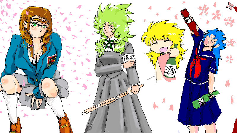 今日は制服祭りでしたv左から、ボインメガネ優等生バラン子(もす)鬼厳しい風紀委員長シオン嬢(mあさん)悪い先輩に影響されちゃたテテ子(ご自身も酔っていたsうさん)悪い先輩。セーラー服でラッパ飲み豪快w(pきさん)qんさんもおしゃべりにいらっしゃいましたvひさしぶりでも普通にこのテンションw春らしく萌えて良いイラストになりましたねv皆様ありがとうございました!!