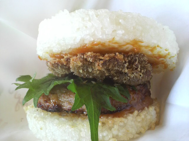 天地人バーガーは八海山のふもとで。コシヒカリライスバーガーに地産のきのこと豚と味噌とシソ。ネタで食ったのにめちゃウマでした!