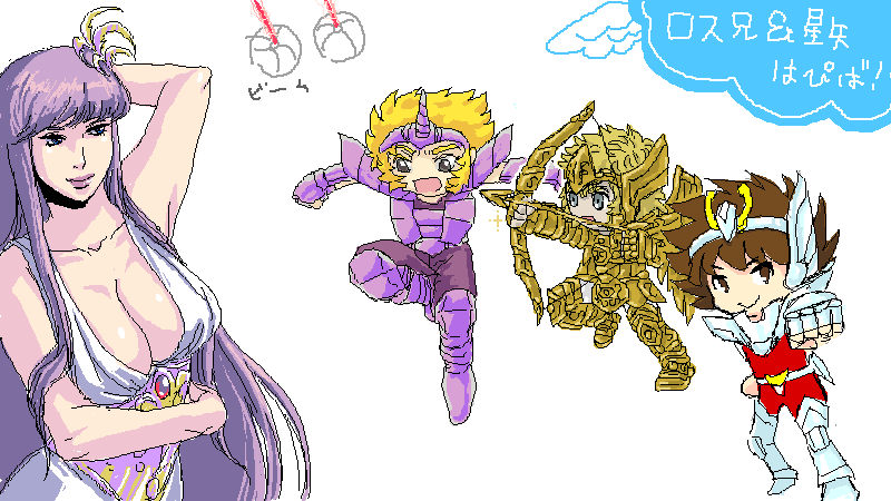 今日もやりました! みなさん早めに上がられたのと主催者が風邪っ引きだったので11時すぎに終了です!健康的! ロス誕と星矢誕が近いのです! Mちょさんの美爆乳女神を奪い合う3人組、邪武(もす)、ロス兄(Kじさん)、星矢(Sうさん)! ロス兄が邪武と女神のワキを狙っています!! Sうさんもおっぱい星人だということがわかったので、おっぱい談義に花をさかせつつ、冥界勢にも女物の冥衣があったらいいなーという話になりました。機会があれば冥界にょた祭りをしましょうv 最後のあいさつはジーク・おっぱい! みなさん本日もありがとうございました! 今度はゆっくりやりましょう~v