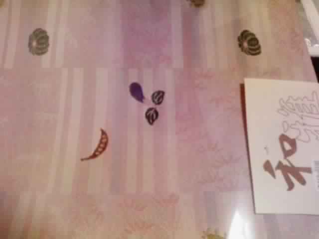 薄い桃色に野菜の柄と、黒地に鞠。どちらも京袋帯です。